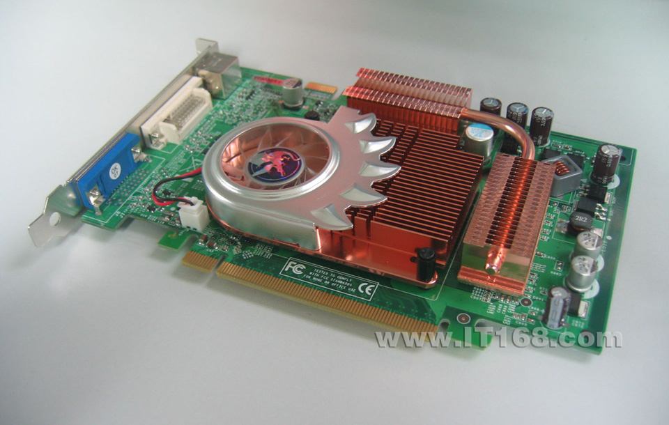 这款显卡最吸引眼球的是其散热系统,采用大面积铜散热片+热管+主动散热风扇的三重散热设计:显示核心上覆盖有一款大面积铜制散热片,同时配合磁悬浮风扇;两部分高速显存都配有铜制散热鳍片,并通过U型热管上下连接,平衡散热片上下端的温差;磁悬浮主动散热风扇为半开口设计,出风口对准中后部,同时兼顾显示核心和显存,利用风能带走散热片上热量。整套系统一气呵成,三元合一,组成一套完整高效静音散热系统。