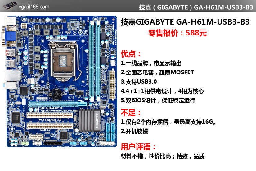 技嘉(GIGABYTE)GA-H61M-USB3-B3,588元。京东商城链接:http://www.360buy.com/product/359858.html