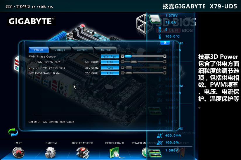 技嘉3D Power包含了供电方面细粒度的调节选项,包括供电相数,PWM频率,电压,电流保护温度保护等。