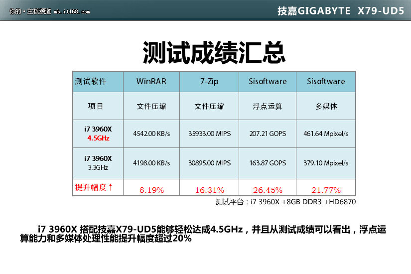 i7 3960X 搭配技嘉X79-UD5能够轻松达成4.5GHz,并且从测试成绩可以看出,浮点运算能力和多媒体处理性能提升幅度超过20%