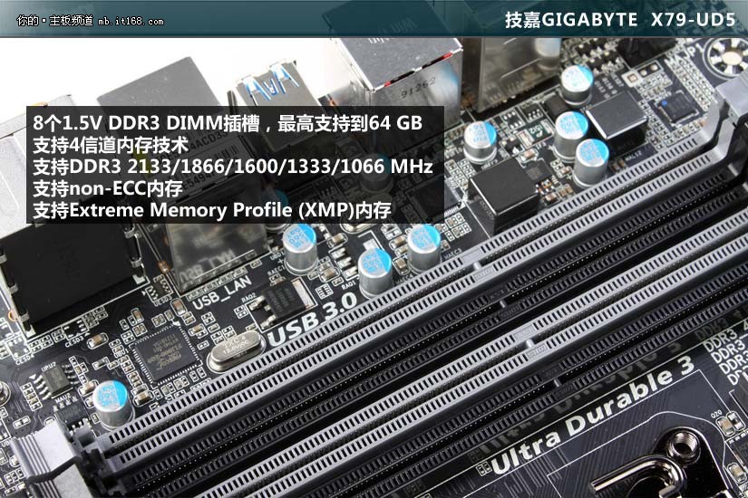 8个1.5V DDR3 DIMM插槽,最高支持到64 GB