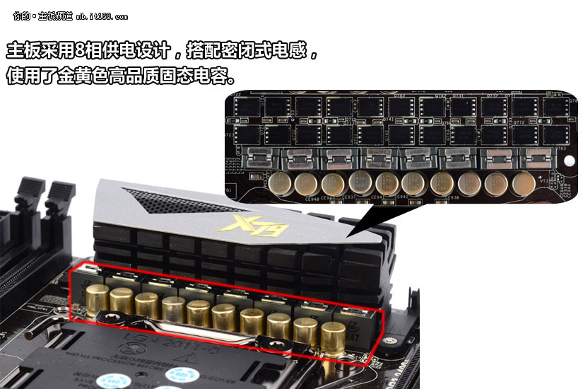 主板采用8相供电设计,搭配密闭式电感,使用了金黄色高品质固态电容。
