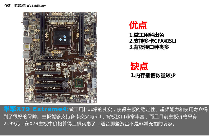 华擎X79 Extreme4做工用料非常的扎实,使得主板的稳定性、超频能力和使用寿命得到了很好的保障。主板能够支持多卡交火与SLI,背板接口非常丰富,而且目前主板价格只有2199元,在X79主板中价格算得上很实惠了,适合那些资金不是非常充裕的玩家。