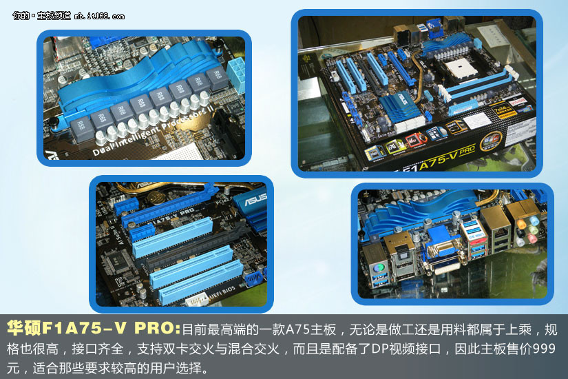 华硕F1A75-V PRO:目前最高端的一款A75主板,无论是做工还是用料都属于上乘,规格也很高,接口齐全,支持双卡交火与混合交火,而且是配备了DP视频接口,因此主板售价999元,适合那些要求较高的用户选择。