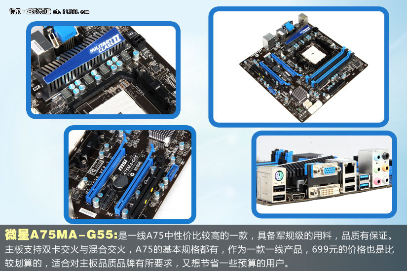 微星A75MA-G55:是一线A75中性价比较高的一款,具备军规级的用料,品质有保证。主板支持双卡交火与混合交火,A75的基本规格都有,作为一款一线产品,699元的价格也是比较划算的,适合对主板品质品牌有所要求,又想节省一些预算的用户。