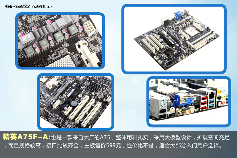 昂达A75T魔固版:是一款通路产品,做工用料上可,小板型主板的扩展空间较小,但整体规格还算不错,499元的价格比较便宜,整体性价比适合最求价格又对规格有些要求的用户选择。