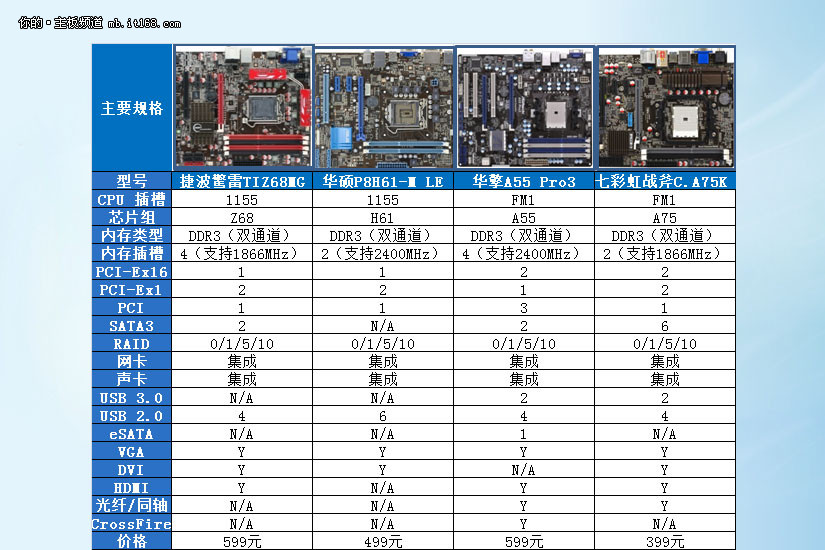 四款整合主板推荐:捷波驚雷TIZ68MG、华硕P8H61-M LE、华擎A55 Pro3、七彩虹战斧C.A75K