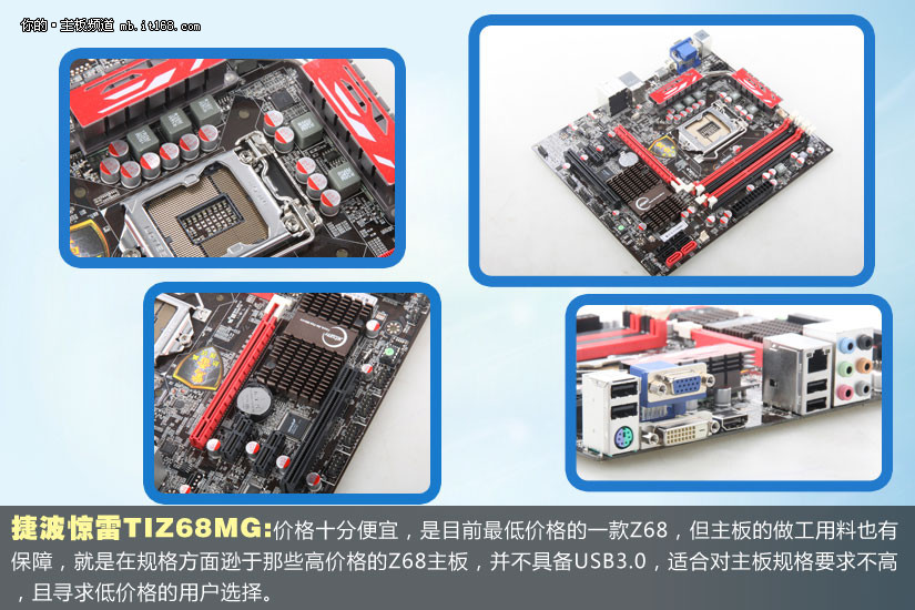 捷波惊雷TIZ68MG:价格十分便宜,是目前最低价格的一款Z68,但主板的做工用料也有保障,就是在规格方面逊于那些高价格的Z68主板,并不具备USB3.0,适合对主板规格要求不高,且寻求低价格的用户选择。