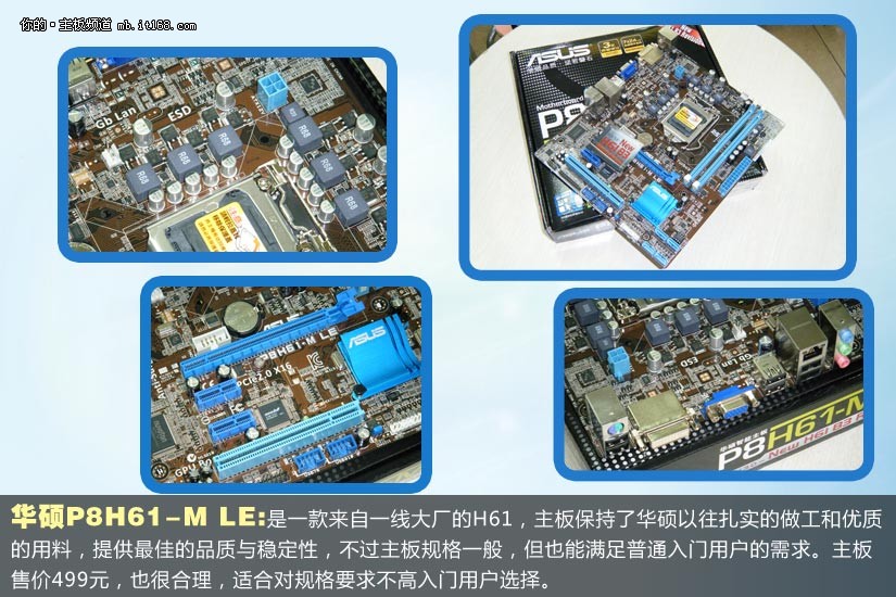 华硕P8H61-M LE:是一款来自一线大厂的H61,主板保持了华硕以往扎实的做工和优质的用料,提供最佳的品质与稳定性,不过主板规格一般,但也能满足普通入门用户的需求。主板售价499元,也很合理,适合对规格要求不高入门用户选择。
