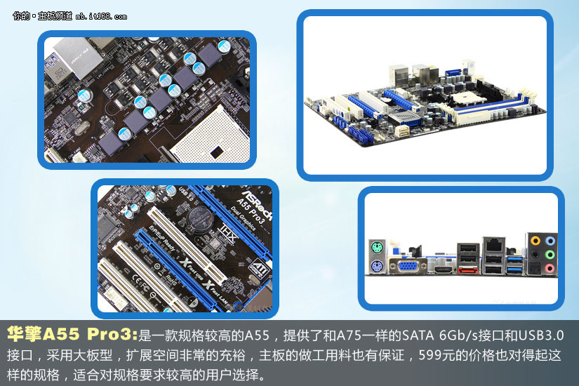 华擎A55 Pro3:是一款规格较高的A55,提供了和A75一样的SATA 6Gb/s接口和USB3.0接口,采用大板型,扩展空间非常的充裕,主板的做工用料也有保证,599元的价格也对得起这样的规格,适合对规格要求较高的用户选择。