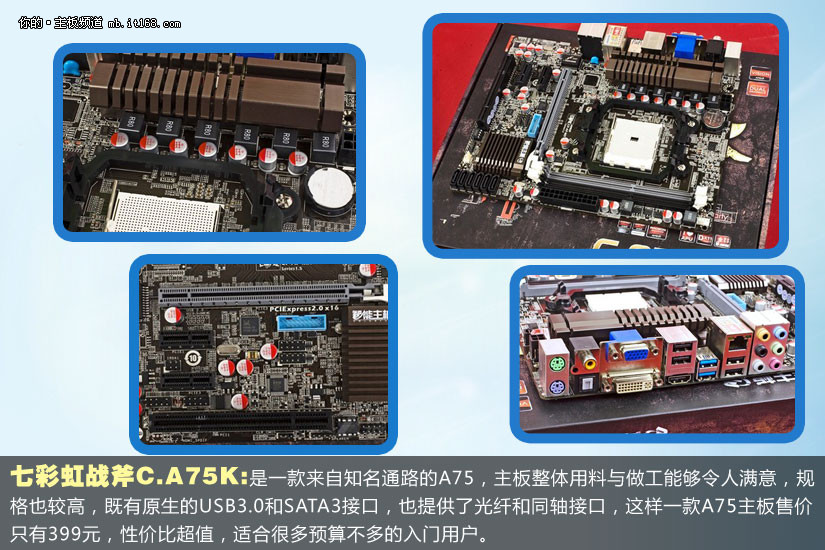 七彩虹战斧C.A75K:是一款来自知名通路的A75,主板整体用料与做工能够令人满意,规格也较高,既有原生的USB3.0和SATA3接口,也提供了光纤和同轴接口,这样一款A75主板售价只有399元,性价比超值,适合很多预算不多的入门用户。