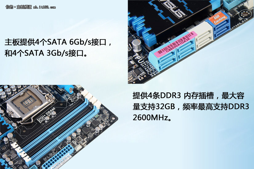 主板提供4个SATA 6Gb/s接口,和4个SATA 3Gb/s接口。提供4条DDR3 内存插槽,最大容量支持32GB,频率最高支持DDR3 2600MHz。