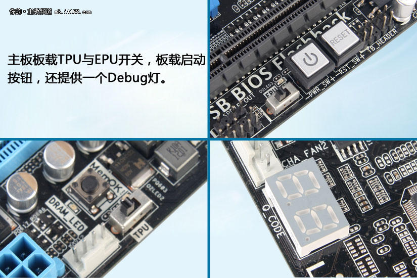 主板板载TPU与EPU开关,板载启动按钮,还提供一个Debug灯。